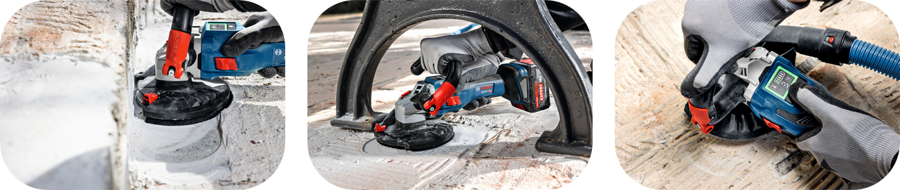 Brúska na betón Bosch GBR 18V-15 S Professional poskytuje výkonnú akumulátorovú funkčnosť bez kompromisov. Technológia bezuhlíkového motora zaisťuje vynikajúcu mieru úberu. Náradie uľahčuje prístup do stiesnených priestorov vďaka otočnej prídavnej rukoväti. Zarovnávacie brúsenie blízko okrajov je navyše s pohyblivým ochranným prvkom veľmi jednoduché. Brúska Bosch poskytuje profesionálne výsledky na rôznych materiáloch vďaka nastaveniu rýchlosti cez používateľské rozhranie HMI. Zároveň zvyšuje úroveň bezpečnosti používateľa prostredníctvom funkcií, ako sú KickBack Control, Brake System a Drop Control.