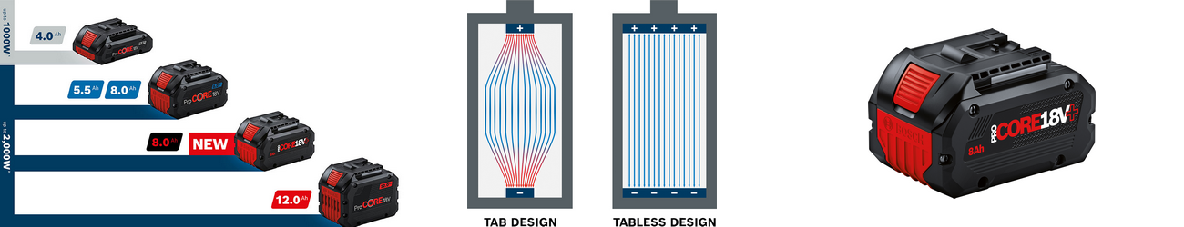 Firma Bosch sa stala priekopníkom v oblasti akumulátorových technológií, keď ako prvá priniesla bezpáskovú technológiu do akumulátorových článkov 18 V akumulátorov pre akumulátorové elektrické náradie. Nový akumulátor ProCore18V+ s kapacitou 8,0 Ah ešte viac predlžuje dobu chodu vysoko výkonného radu akumulátorov Bosch ProCore18V, čím prináša profesionálom v obchode a priemysle výrazné zvýšenie efektivity.
