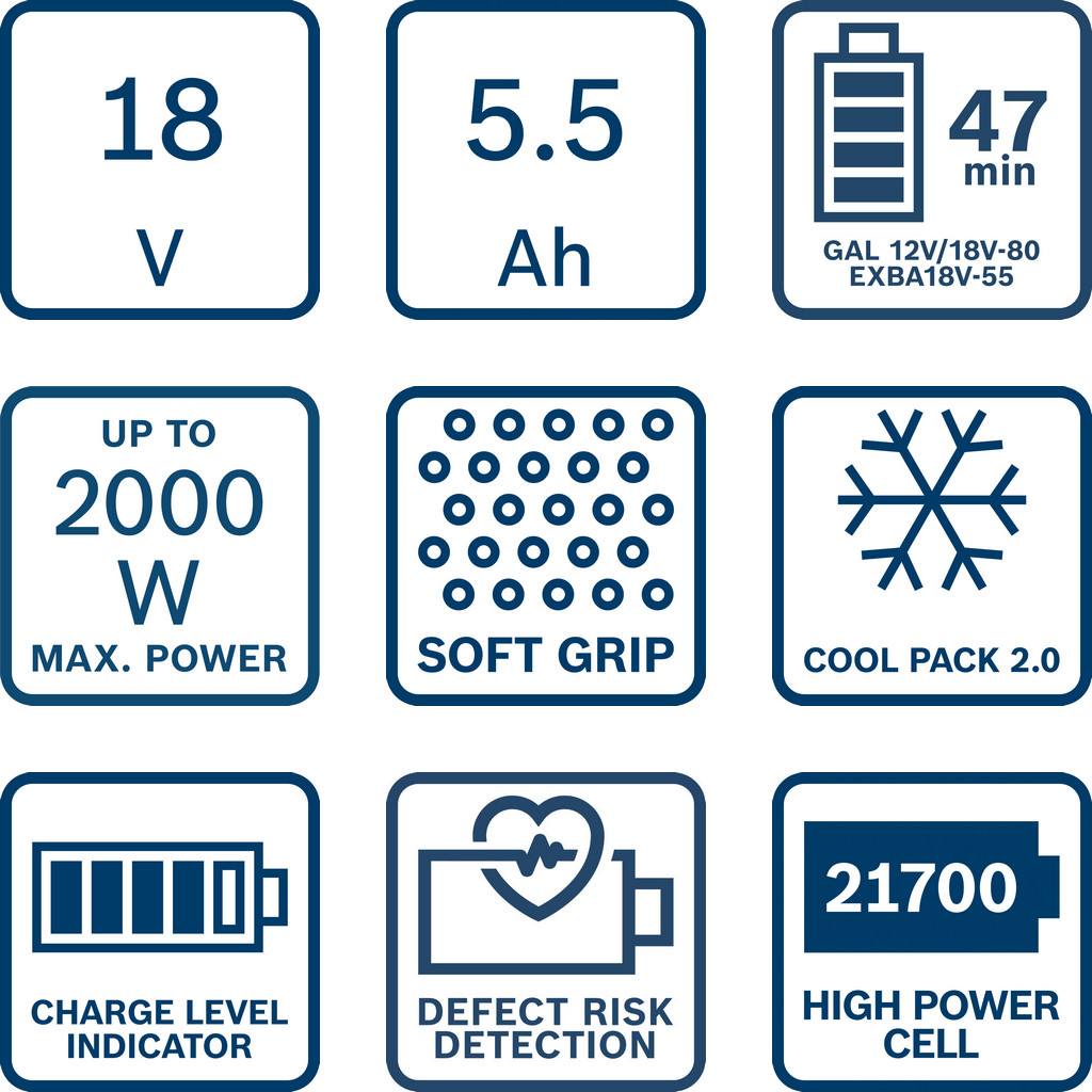 Bosch EXBA18V-80 aj EXBA18V-55 má LED indikátor s 5 LED diódami zobrazujúcim stav nabitia so zostávajúcou kapacitou a detekciou rizika poruchy. Mobilná ultrarýchla paralelná nabíjačka poskytne tri režimy nabíjania, Standard (štandardný), Power Boost (plné nabitie najvyššou rýchlosťou nabíjania) a Long Life (dlhá výdrž). Má LED indikátor s 5 LED diódami na presnú indikáciu stavu nabitia. Kompatibilita so systémom Bosch Professional 18V a alianciou výrobcov akumulátorov AMPShare. Bosch EXBA18V-80 s hmotnosťou 1,04 kg a Bosch EXBA18V-55 s hmotnosťou 1,02 kg.