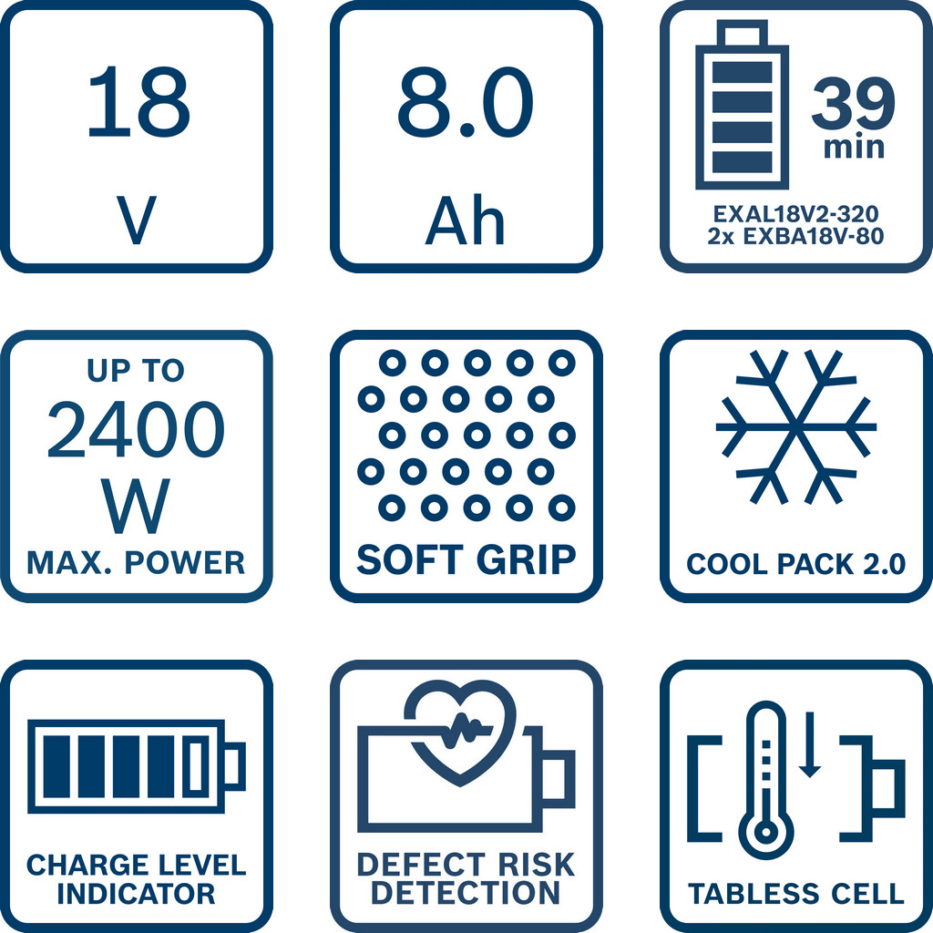 Vysokovýkonný akumulátor Bosch Expert EXBA18V-80 Professional poskytuje až o 120 % dlhšiu dobu prevádzky aj pri náročnom používaní (v porovnaní s Professional GBA 18V 4.0Ah; laboratórne údaje z interného testovania; brúsenie mäkkej ocele s GWS 18V-15 S + lamelový kotúč, 30-sekundové intervaly s 5-sekundovými prestávkami). Využíva pokročilú technológiu bezzápadkových článkov, ktorá poskytuje maximálny výkon až 2400 W. (laboratórne údaje z interného testovania; okamžitý maximálny výkon, maximálne nabitie, nový akumulátor). Vysokovýkonný akumulátor Bosch Expert EXBA18V-55 Professional poskytuje maximálny výkon až 2000 W na náročné používanie v kombinácii s dlhšou dobou chodu (na základe interného laboratórneho testovania; okamžitý maximálny výkon s maximálne nabitým novým akumulátorom). Vďaka zosilnenému robustnému telu a vynikajúcemu tepelnému manažmentu s technológiou COOLPACK 2.0 sú oba akumulátory zárukou odolnosti a dlhej životnosti. Bosch EXAL18V2-320 Professional nabíja dva akumulátory súčasne prúdom 16 A, takže sa dva akumulátory EXBA18V-80 plne nabijú už za 39 minút a dva akumulátory EXBA18V-55 už za 31 minút. Nabíjačka je vybavená inteligentnými technológiami Active Air Cooling 3.0 a FlexTemp Charging, ktoré rozširujú teplotný rozsah nabíjania od -10 °C do +55 °C. Výrazne redukuje prestoje, keďže umožní rýchlonabíjanie teplých aj chladných akumulátorov. Všetko je prakticky uložené v na mieru vyrobenom kufri L-BOXX.