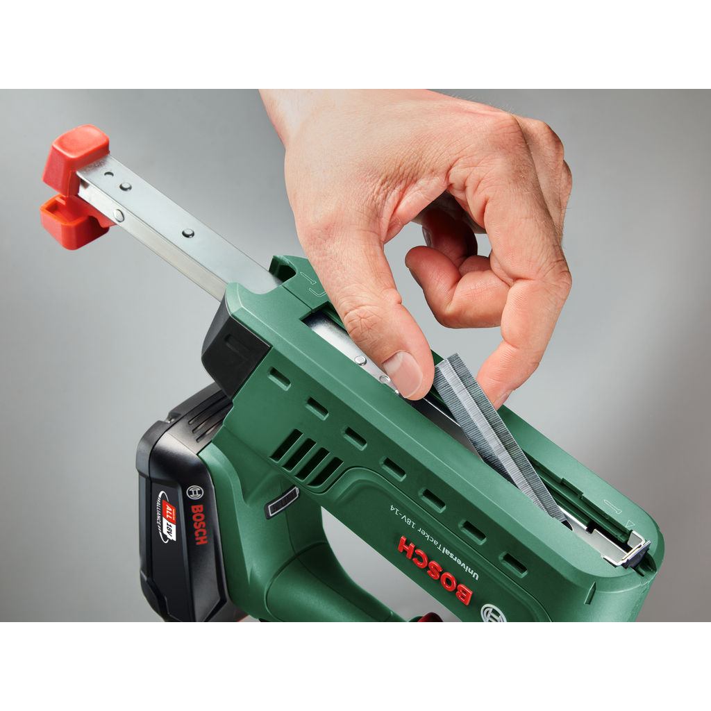 Bosch UniversalTacker 18V-14 je akumulátorová klincovačka a sponkovačka, ktorá prináša novú úroveň komfortu a všestrannosti pri upevňovaní v domácnosti. Toto ergonomické náradie navrhnuté na jednoduché spinkovanie a klincovanie zvláda výkonné spinkovanie a klincovanie do mäkkého a tvrdého dreva. Pri práci s rozličnými materiálmi a dĺžkami spiniek je možné upraviť silu úderu na optimálnu hodnotu otáčaním kolieska sily úderu. Systém stlačenia a uvoľnenia zaručuje optimálnu kontrolu pri práci elimináciou samovoľného spustenia. Pri rýchlych upevňovacích prácach, napr. výstelke zvýšených záhradných záhonov, je možné aktivovať funkciu kontaktnej aktivácie, ktorá dosahuje až 30 úderov za minútu. A vďaka praktickému indikátoru naplnenia je možné ľahko skontrolovať množstvo spiniek a ľahko doplniť sponkovačku. Zabudovaná technológia Bosch Syneon poskytuje optimálny výkon a maximálnu dobu prevádzky. Toto náradie patrí do systému 18V POWER FOR ALL. Jeden akumulátor pre všetko náradie 18V POWER FOR ALL.