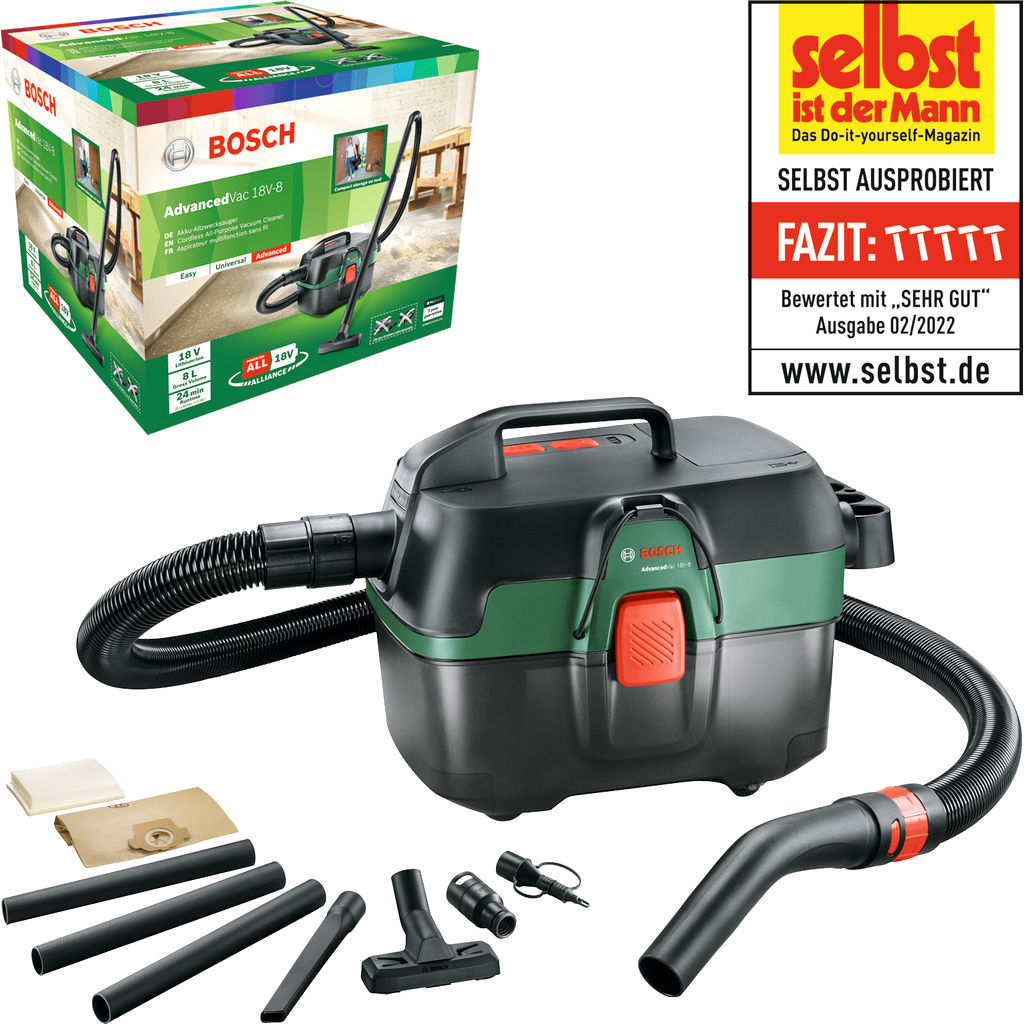 AdvancedVac 18V-8 je prenosný všestranný vysávač Bosch 3 v 1 na odstraňovanie nečistôt a nafukovanie v interiéri aj exteriéri. Vďaka sérii užitočného príslušenstva umožňuje rýchle čistenie mokrých a suchých nečistôt alebo prachu, hrubých a jemných nečistôt v domácnosti, záhrade, automobile alebo karavane. Vysávač možno jednoducho pripojiť k elektrickému náradiu série Bosch Home & Garden a iných výrobcov vďaka flexibilnému univerzálnemu adaptéru, a tak zaručuje čisté pracovisko. Toto je vysávač Bosch typu 3 v 1, ktorý vďaka integrovanej funkcii takisto umožňuje nafukovanie a vyfukovanie, a poskytuje praktické využitie pri odfukovaní lístia v záhrade alebo nafukovaní vzduchových matracov a hračiek do bazéna. Využívajte praktickú predĺženú výdrž akumulátora v režime Eco a objem nádoby 8 litrov, ako aj kolieska a predlžovacie rúry na praktické čistenie podlahy, z ktorého vás nebude bolieť chrbát. Toto náradie patrí do aliancie POWER FOR ALL ALLIANCE. Jeden akumulátor možno používať s množstvom náradia rozličných značiek.