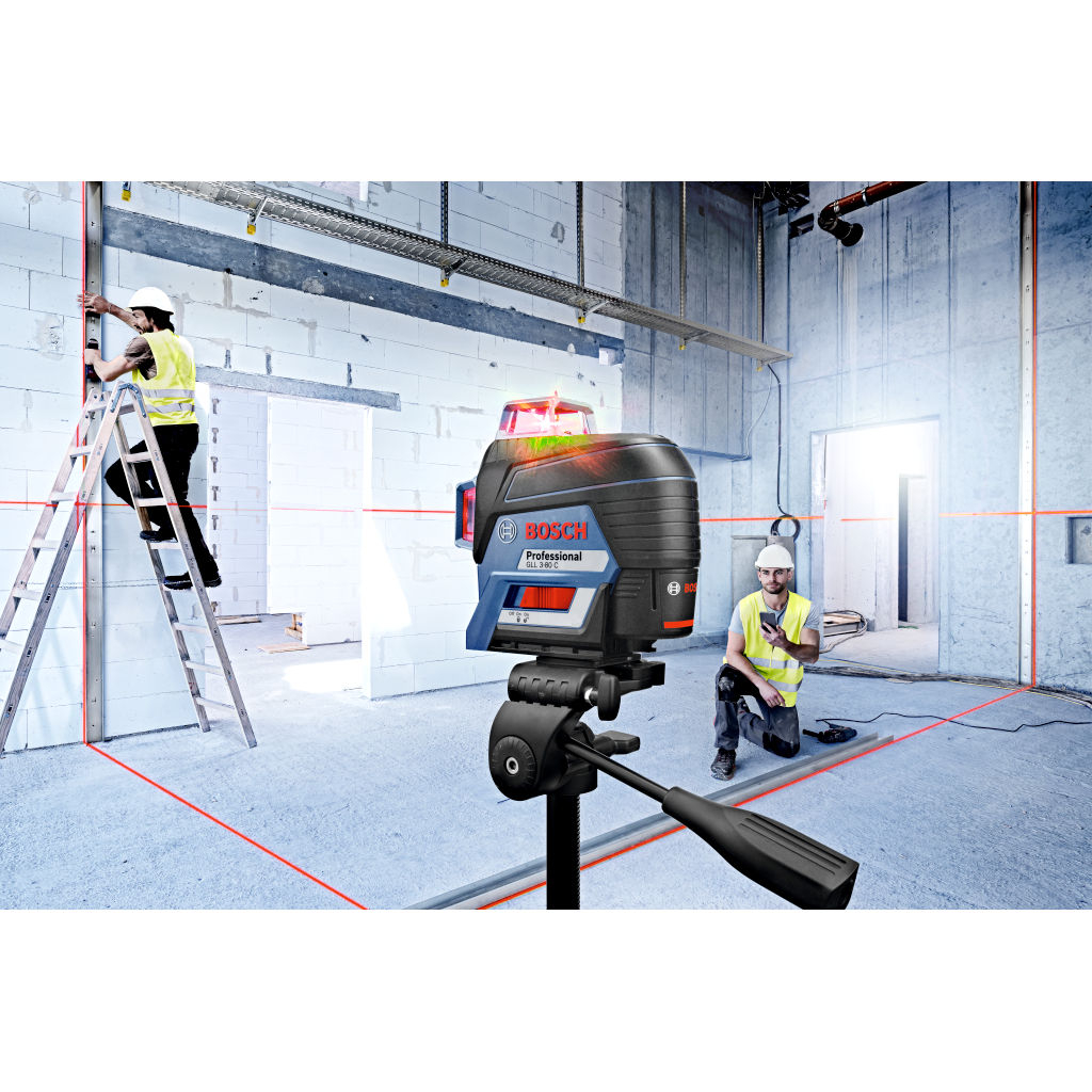 Líniový laser Bosch GLL 3-80 C Professional sa jednoducho pripája a premieta 3 línie s rozsahom 360° poskytujúce vynikajúcu viditeľnosť. Inovačné monitorovanie CAL Guard a aplikácia pre inteligentný telefón s rozhraním Bluetooth® umožňuje vzdialené ovládanie, ako aj bezkontaktné nastavenie a vysokú presnosť. Vysokovýkonné diódy zaručujú vysokú jasnosť, tri línie s rozsahom 360° umožňujú súčasné horizontálne a vertikálne vyrovnanie a mimoriadne efektívnu prácu. Tento líniový laser je určený na realizáciu podláh, montáž okien, montáž políc, kladenie odpadových potrubí, montáž konštrukcií suchej výstavby a kladenie dlažieb a obkladov. Vďaka duálnemu systému napájania je možné používať GLL 3-80 C Professional s akumulátorom 12 V Li-ion alebo bežnými alkalickými batériami. Prístroj sa ustáli na nerovných povrchoch ±4° za menej než 4 sekundy s excelentnou presnosťou ±0,2 mm/m*/** a poskytuje pracovný dosah 120 m pri použití voliteľného prijímača LR 6 alebo LR 7 Professional. Tento líniový laser je kompaktný, ľahko použiteľný a extrémne robustný.