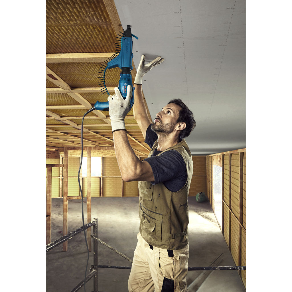 S elektrickým skrutkovačom Bosch GTB 650 Professional je montáž sadrokartónu praktická, efektívna a cenovo dostupná – zvládne práce so sadrokartónom, tenkou oceľou a plechom. Tento účinný skrutkovač s motorom s otáčkami až 5 000 ot/min umožňuje nasadenie automatického zásobníka skrutiek MA55 a automatické podávanie skrutiek na rýchlu montáž sadrokartónu. Reverzibilný hĺbkový doraz umožňuje odskrutkovávanie bez nutnosti jeho odoberania a zaručuje pohodlie a bezpečnosť. Používajte toto náradie so skrutkami do sadrokartónu priemeru až 4 mm v jednej vrstve sadrokartónu na ľahkej oceľovej nosnej konštrukcii a samoreznými skrutkami priemeru až 6 mm do oceľového plechu hrúbky 1,5 mm.