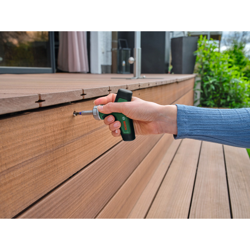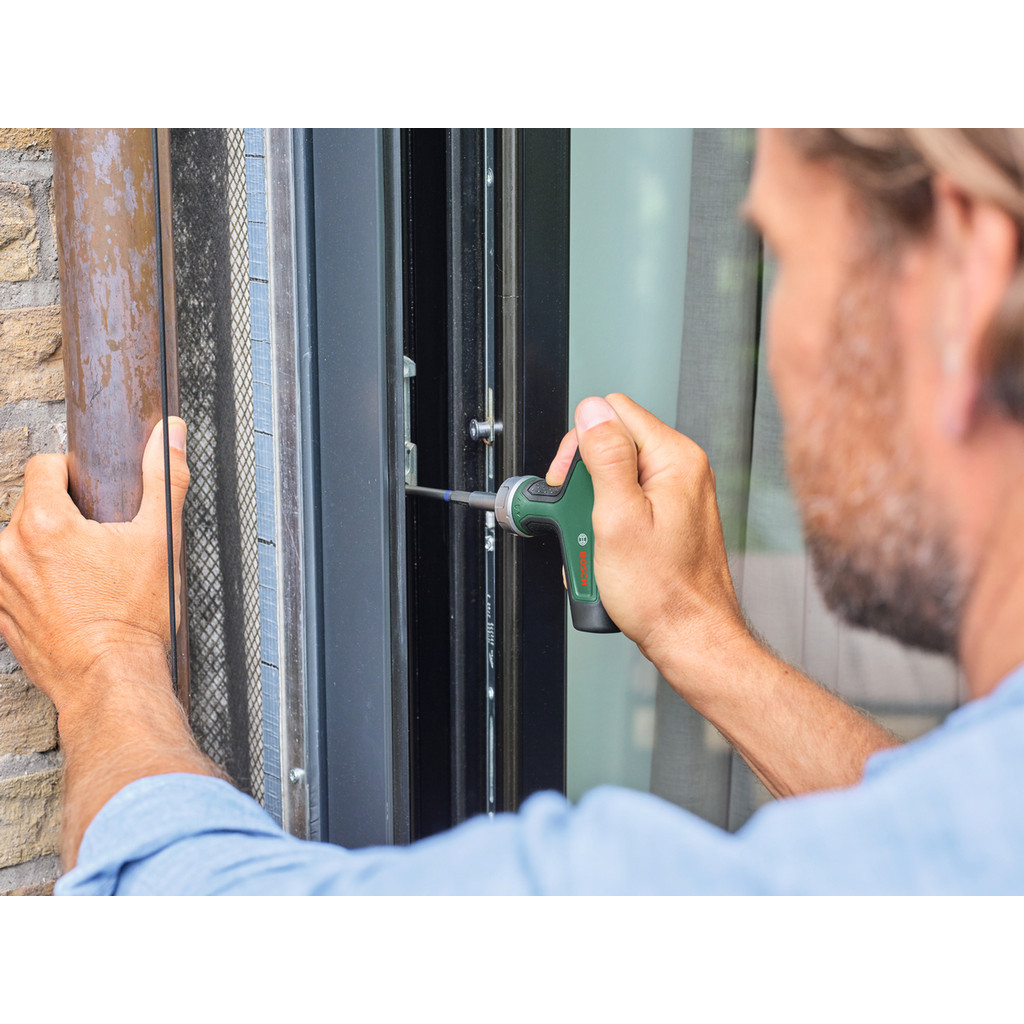 Skrutkovač Bosch s račňou na skrutkovacie hroty a rukoväťou tvaru T Bosch je ideálnym náradím na náročné práce a práce v ťažko dostupných priestoroch. Rukoväť tvaru T poskytuje vyšší prenos sily a mechanizmus s 36 zubami vyrobený práškovou metalurgiou umožňuje uťahovací moment až 46 Nm. Tento skrutkovač s račňou na skrutkovacie hroty je kompaktný a ergonomický, umožňuje vyšší komfort a lepšie ovládanie pri práci a je vybavený dvojkomponentovou rukoväťou s veľkými mäkkými úchopovými plochami. Intuitívny kovový prstenec na rýchlu zmenu smeru otáčania možno otočiť zľava doprava na rýchlu zmenu smeru; stredná poloha je určená na manuálne skrutkovanie bez použitia račne. Tento skrutkovač s račňou Bosch na skrutkovacie hroty má krátky driek vyrobený z chróm-vanádiovej ocele na ťažkú a precíznu prácu v stiesnených priestoroch. Pri použití vyššej sily zostáva skrutkovací hrot pevne na mieste vďaka silnému magnetickému držiaku skrutkovacích hrotov.