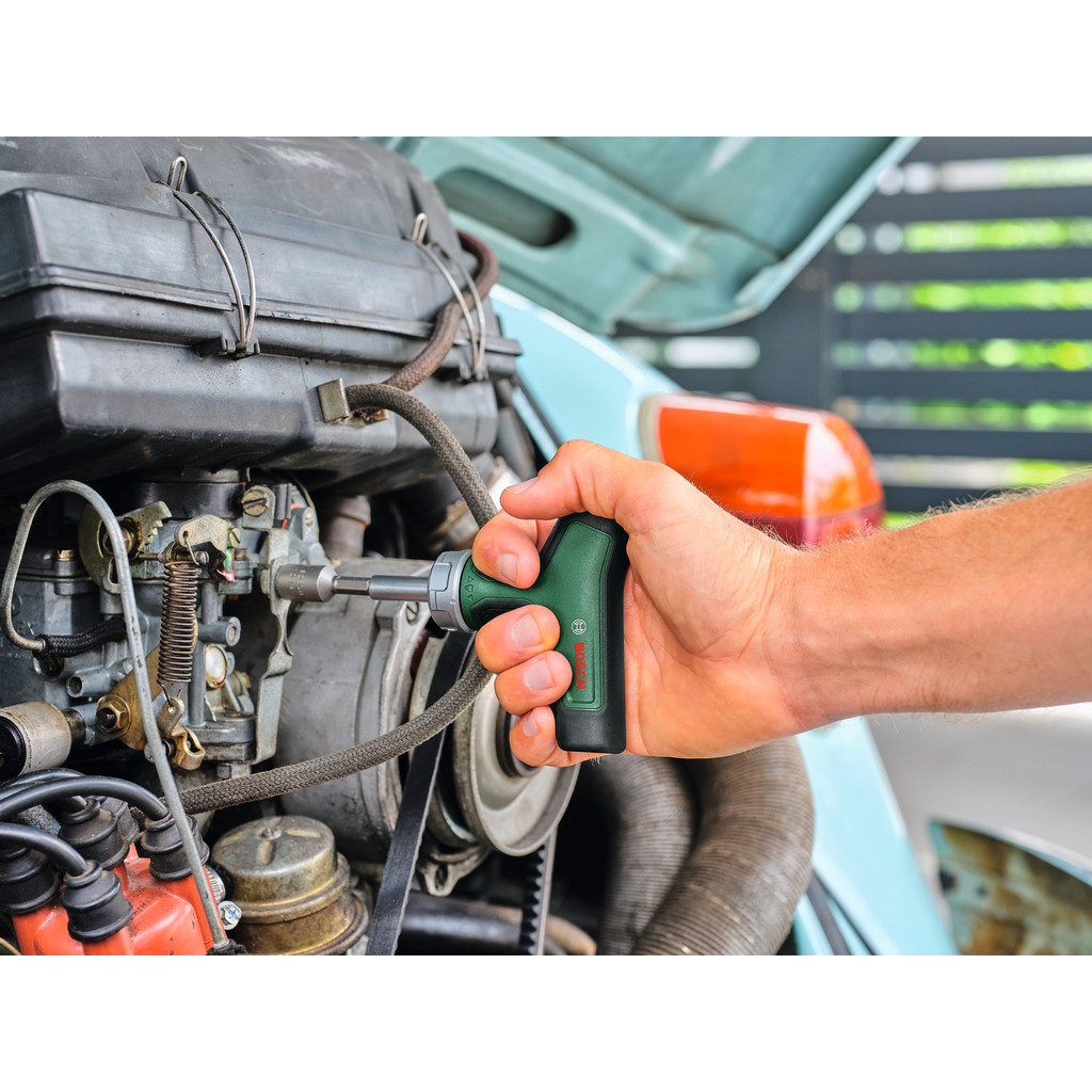Silný, ergonomicky skrutkovač Bosch s račňou na skrutkovacie hroty a rukoväťou tvaru T na efektívnu prácu dokonca aj v stiesnených priestoroch