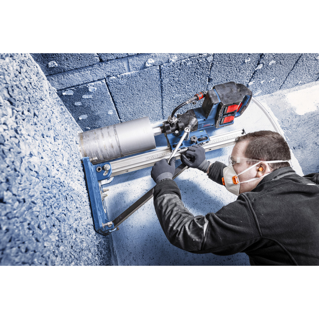 PRO GCR180(II) je prvý plnohodnotný stojan Bosch na používanie s EXPERT EXDB18V2-180 a PRO GDB180WE na vŕtanie s diamantovými vrtákmi. Tento robustný stojan uľahčuje vŕtanie s diamantovými vrtákmi vďaka odolnému hliníkovému stĺpu s vysokou torznou pevnosťou a otáčaniu o 45°. Okrem stabilnej podpory vám PRO GCR180(II) pomáha zamerať a lokalizovať vyvŕtaný otvor pomocou ukazovateľa stredu vrtáka, bublinovej vodováhy a stupnice hĺbky vŕtania. Pohodlná a jednoduchá inštalácia a demontáž vďaka rýchloupínacej 60 mm objímke a kombinovanej základni, ktorú môžete namontovať ukotvením alebo prísavkou. Kľuku môžete vybrať a použiť ju na nastavenie všetkých skrutiek.