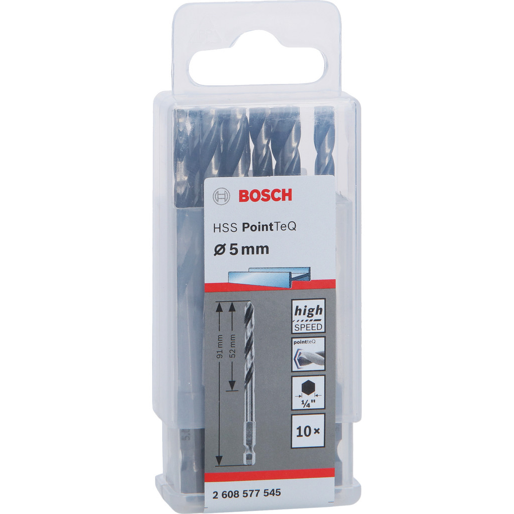 Špirálový vrták Bosch HSS PointTeQ so šesťhrannou stopkou je navrhnutý na rýchle a efektívne vŕtanie do kovu a je vhodný na použitie s vŕtačkami, skrutkovačmi aj príklepovými vŕtačkami či rázovými uťahovačmi. Vysoká rýchlosť vŕtania znižuje tvorbu tepla a opotrebovanie vrtáka, pričom špička Bosch PointTeQ zabezpečuje trvalú ostrosť a dlhú životnosť nástroja. Samostrediaca špička zabraňuje vychyľovaniu vrtáka a umožňuje okamžité a presné navŕtanie bez predvŕtania, zatiaľ čo brunírovaná drážka podporuje rýchly a plynulý odvod triesok. Šesťhranná stopka zaručuje pevné uchytenie vrtáka, spevňuje jeho telo a výrazne znižuje riziko zlomenia pri práci. Krížový výbrus špičky umožňuje aktívne rezanie a dokonalé centrovanie, typ N s uhlom skrutkovnice a 135° uhlom špičky spĺňa normu DIN 338. Vďaka šesťhrannej stopke je zabezpečený maximálny prenos krútiaceho momentu v trojčeľusťových skľučovadlách aj vo vnútornom šesťhrannom upínaní náradia s rozmerom ¼".