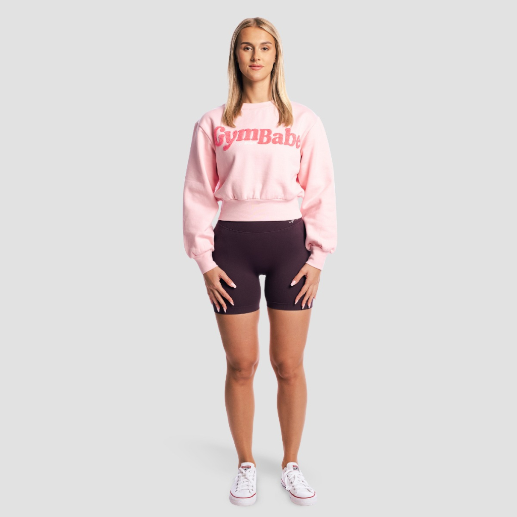 Tento štýlový kúsok má voľnejší strih (relaxed fit), ktorý poskytuje maximálnu slobodu pohybu. Zároveň vďaka elastickému spodnému lemu pekne drží tvar a vytvára ženskú siluetu napriek voľnému strihu. Dizajn dopĺňajú mierne balónové (puffy) rukávy, ktoré sú zakončené elastickými manžetami. Na prvý pohľad však zaujme textúrované, plyšové logo „GymBabe“, ktoré mikine dodáva jedinečný a hravý vzhľad.
