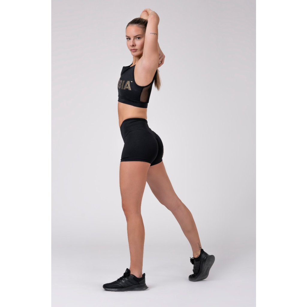 Dámske šortky Intense Gold Print Black sú jedinečné športové šortky pre ženy, ktoré si zamilujete pre ich štýlový dizajn a mimoriadne pohodlný, elastický materiál. Práve vďaka nemu sa šortky jednoducho prispôsobia každému typu postavy. Zadná časť šortiek je vytvorená pomocou špeciálneho šitia v tvare písmena “V”, čo zaručuje perfektné vytvarovanie vášho pozadia. Šortky sú navyše doplnené o výrazné zlaté logo značky Nebbia. Zamilujete si ich nielen pri náročných tréningoch, ale aj pri cyklistike, behu, korčuľovaní či prechádzkach v prírode.
