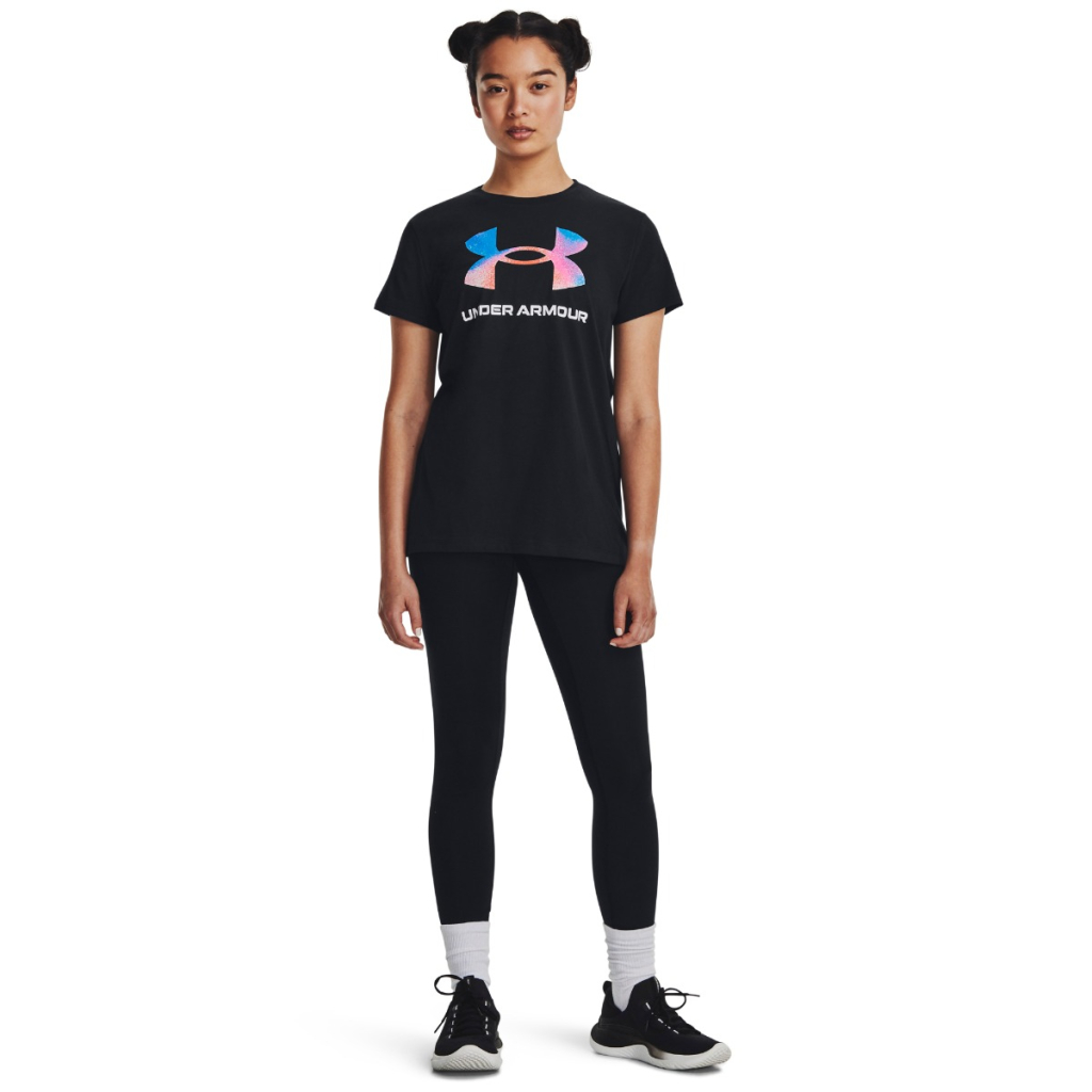 Dámske Tričko W Sportstyle Logo SS je jednoduchý a štýlový kúsok s elegantným dizajnom. Má veľké a farebné trblietavé logo UA a rebrovaný golier. Môže sa tiež pochváliť mimoriadne mäkkým materiálom tvoreným zmesou bavlny a polyesteru. Hodí sa na šport aj bežné nosenie.