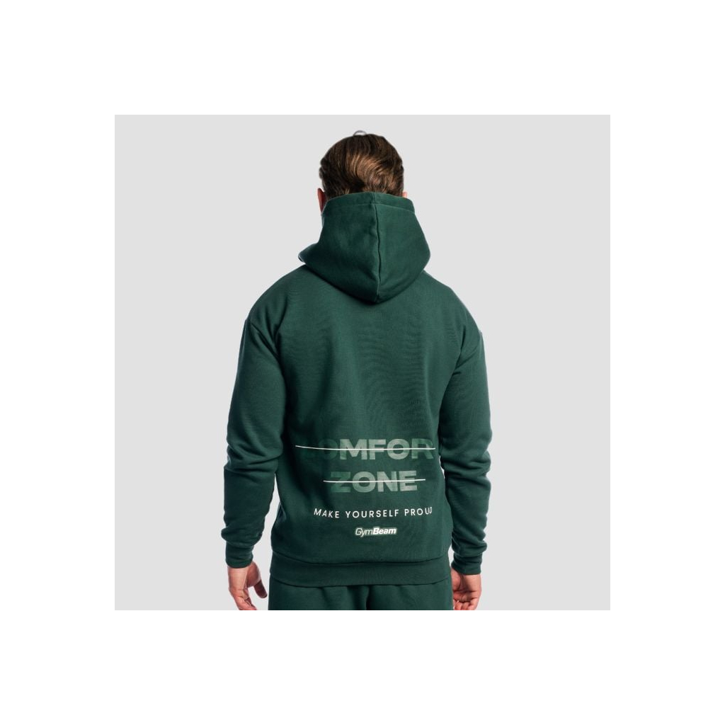 Táto pánska mikina sa vyznačuje trendy oversized strihom, ktorý poskytuje maximálnu voľnosť pohybu a nekompromisné pohodlie. Je vybavená kapucňou so sťahovacou šnúrkou, bočnými vreckami a zapínaním na zips po celej dĺžke. Dizajn je zpredu minimalistický, zdobený len malým logom GymBeam. Výraznejšia je zadná časť s veľkým prečiarknutým nápisom „COMFORT ZONE“ a mottom „MAKE YOURSELF PROUD“, ktoré slúži ako neustála pripomienka vašich cieľov.