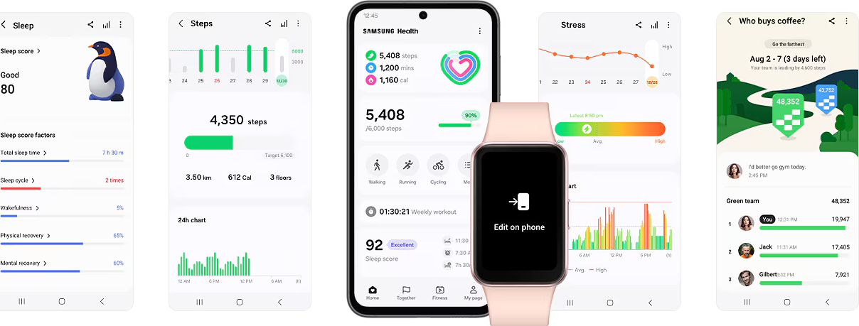 Sprístupni si množstvo informácií o zdraví pomocou aplikácie Samsung Health v telefóne. Jednoducho zosynchronizuj údaje zo zariadenia Galaxy Fit3 a získaj komplexný prehľad o svojich tréningových výkonoch, zdravotných pokrokoch, spánkových návykoch a ďalších parametroch. Vďaka praktickému zobrazeniu nahromadených zdravotných údajov na väčšej obrazovke tak môžeš sledovať svoju cestu za zdravým životným štýlom počas dlhšieho časového obdobia.
