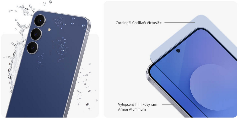 Smartfón Galaxy S25 FE chráni odolné sklo Corning Gorilla Glass Victus+ a vylepšený hliníkový rám Armor Aluminum. Navyše je vyrobený z odolných a prémiových materiálov. Jeho spoľahlivosť podčiarkuje certifikácia IP68, ktorá potvrdzuje odolnosť proti prachu a vode, takže mobil môžete bez obáv vziať so sebou na všetky svoje dobrodružstvá.