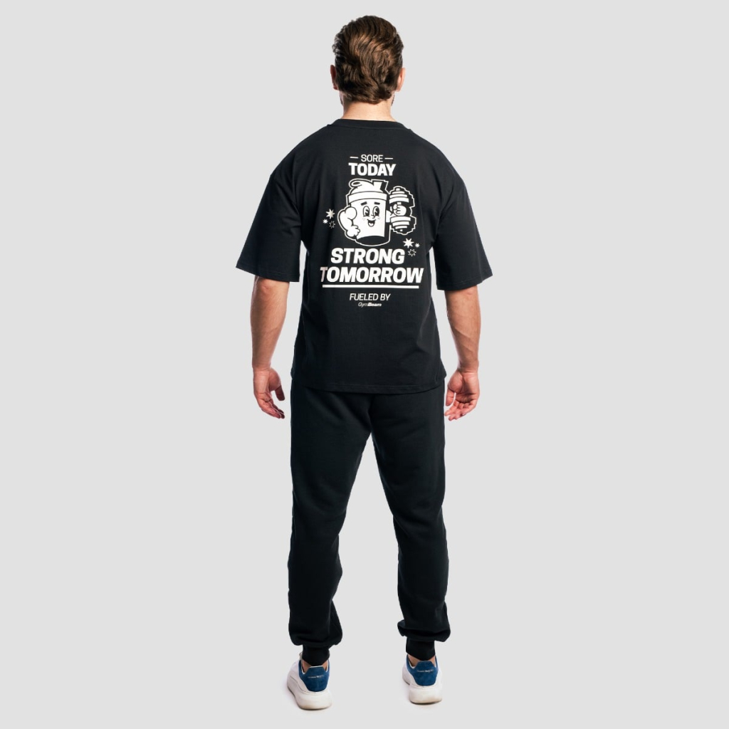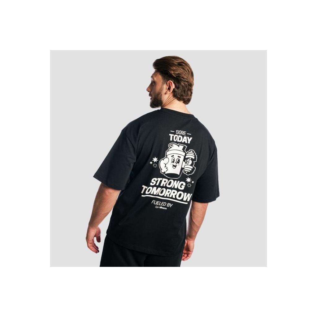 Toto pánske tričko sa vyznačuje trendovým boxy oversized strihom, ktorý charakterizuje širšia silueta a spadnuté ramená pre maximálne pohodlie a štýl. Spredu ho zdobí len malá potlač hravého šejkra. Výraznejšia je zadná časť s veľkou retro potlačou a motívom „SORE TODAY, STRONG TOMORROW“, ktorý vám bude neustále pripomínať, prečo na sebe makáte.