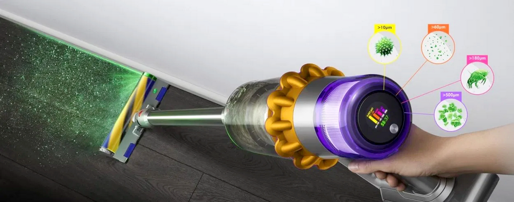 Vďaka dokonale utesnenému filtračnému systému vo vysávači Dyson V15 Detect Absolute 2023 je zachytených 99,97 % mikroskopických častíc a alergénov od veľkosti iba 0,1 mikrónu, čo znamená, že vypúšťa čistejší a zdravší vzduch do vášho domova.